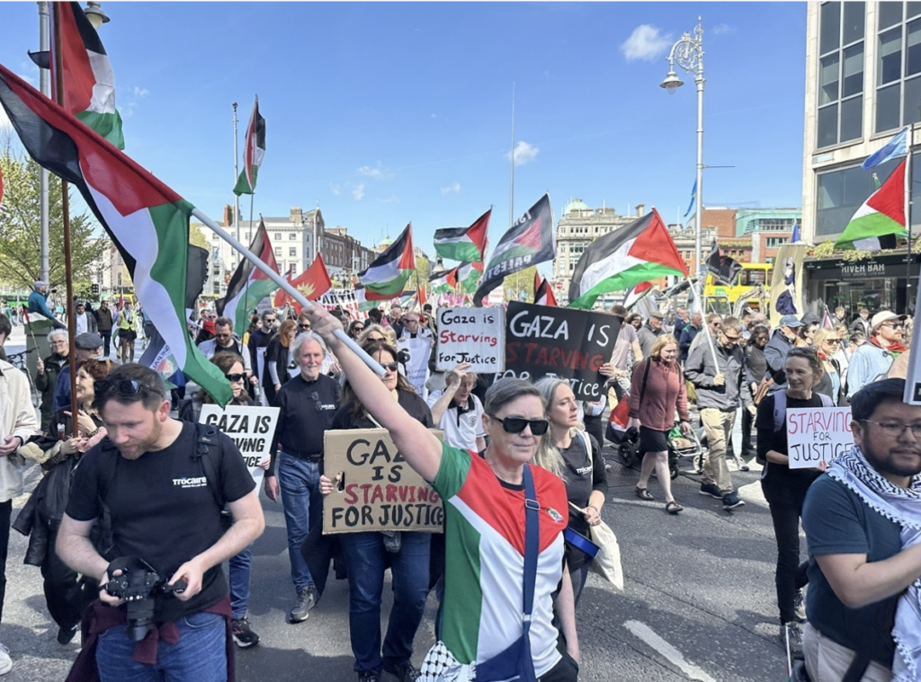 ورفع المتظاهرون الأعلام الفلسطينية والأيرلندية، وطالبوا بوقف هجمات الاحتلال الإسرائيلي على المدنيين في قطاع غزة، كما أطلقوا هتافات من قبيل “نعم للعقوبات على إسرائيل” و”الحرية والعدالة لفلسطين”