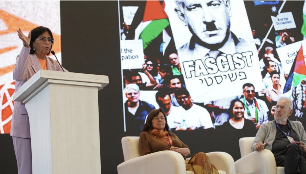 وأضاف “لا يجب علينا أن نتحدث بعد اليوم عن حل الدولتين، هي دولة واحدة ديمقراطية من النهر للبحر، الكفاح المسلح هو الطريق التي فرضته علينا الصهيونية كونها أيدولوجياً إحلالية توسعية، مختتماً كلمته وسط تصفيق مستمر وحار من الجمهور بعاشت فلسطين من النهر للبحر، عاشت فنوزيلا وعاش التضامن بين الشعوب”