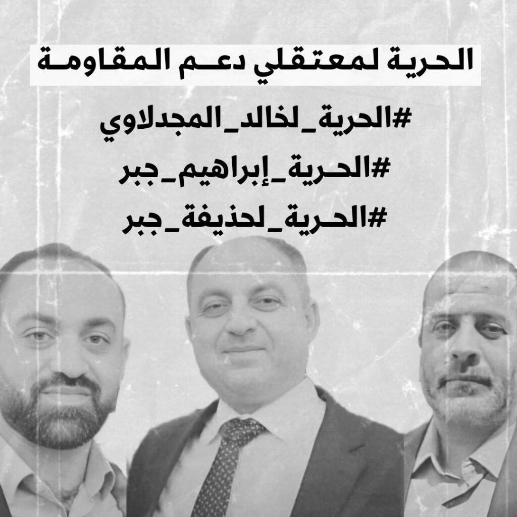 وتحت وسوم #دعم_المقاومة_شرف و #الحرية_لمعتقلي_المقاومة انتشرت تغريدات تدعو لاطلاق سراح خالد المجدلاوي وابراهيم جبر وحذيفة جبر، الذين تعتقلهم السلطات الأردنية منذ عام كامل.
