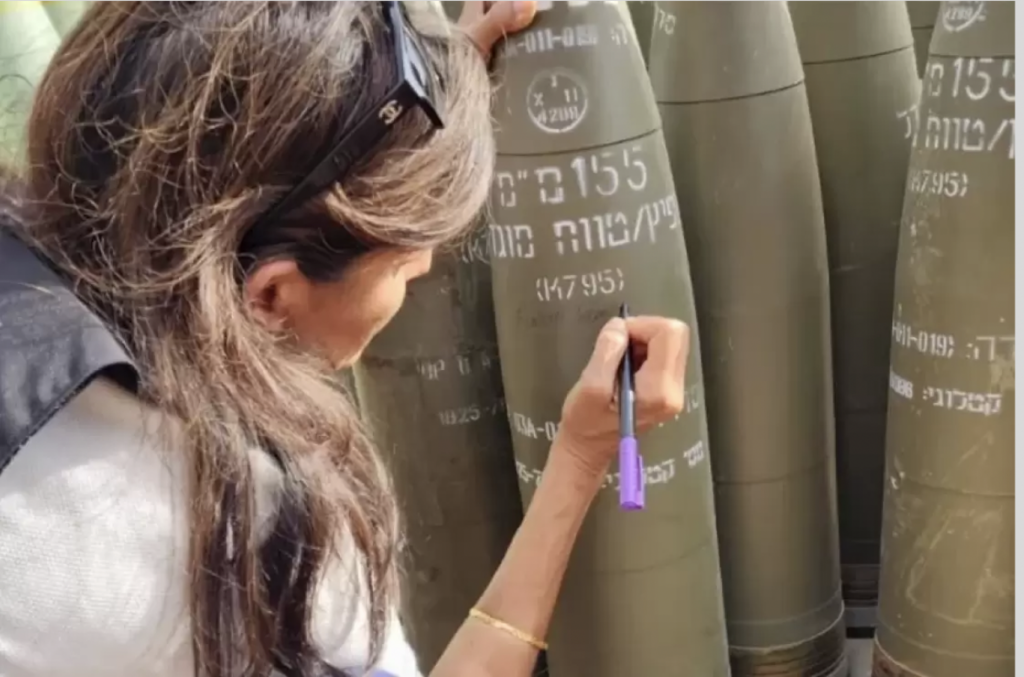 ظهرت المرشحة الجمهورية السابقة للانتخابات الرئاسية الأمريكية نيكي هيلي، تكتب عبارة “اقضوا عليهم” على قذيفة إسرائيلية خلال زيارتها لمواقع عسكرية إسرائيلية بالقرب من الحدود الشمالية مع لبنان.