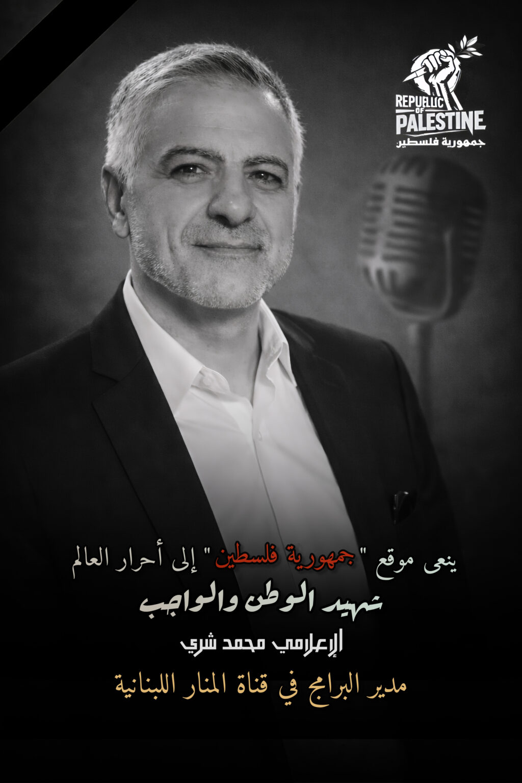 بمزيد من الفخر والاعتزاز، تنعى أسرة تحرير موقع “جمهورية فلسطين” إلى الأمة العربية والإسلامية، وإلى الأسرة الإعلامية المقاومة، الزميل القامة الإعلامية الكبيرة في قناة المنار “الحاج محمد شري”، الذي ارتقى شهيداً اليوم إثر عملية اغتيال غادرة وجبانة نفذها جيش الاحتلال الإسرائيلي في العاصمة اللبنانية بيروت، والتي أدت إلى استشهاده رفقة زوجته.