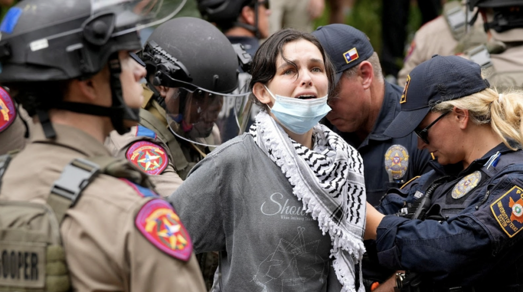 Texas state troopers and University of Texas Police detain a woman at a pro-Palestinian protest at the University of Texas on 24 April, 2024 (Reuters)