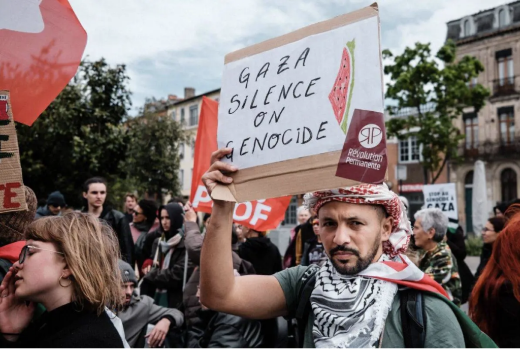 Protester with keffiyeh and ‘Gaza silence on genocide’ sign during the rally in support of the Palestinian people of Gaza held in Toulouse, south-west France, on April 27, 2024 [PAT BATARD/Hans Lucas/AFP via Getty Images]