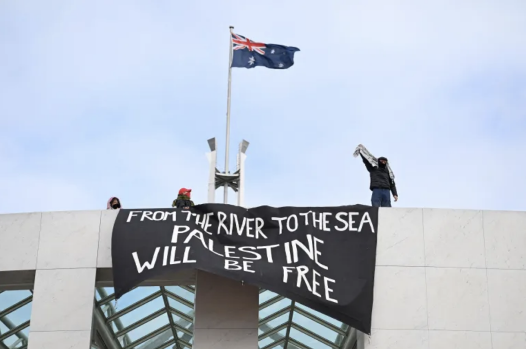 Pro-Palestine protesters have climbed the roof of Australia’s Parliament House in Canberra and unfurled several banners, one of them reading, “From the river to the sea, Palestine will be free”.
