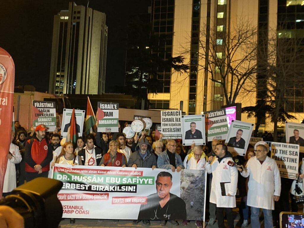 On Friday, January 10, the Istanbul Medical Chamber organized a protest march in front of the Israeli consulate in Istanbul in solidarity with Palestinian doctor Hossam Abu Safieh, who has become a symbol of resistance after standing up to Israeli occupation forces during their raid on Kamal Adwan Hospital in Gaza.