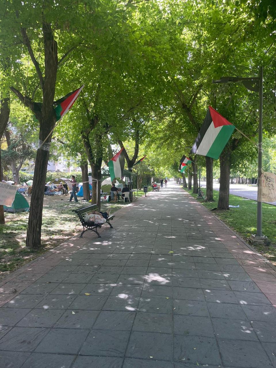 En un pasillo de un jardín acerca de la Universidad de Granada, ondean las banderas palestinas, amparando las tiendas de la acampada de los estudiantes que han elegido la protesta y la lucha como camino para imponer sus demandas a la universidad para cortar las relaciones con las instituciones del ente sionista. Esto es una manifestación más del lema «Andalucía con Palestina» en la ciudad de Granada, donde la movilización no ha parado desde el 7 de octubre hasta el momento, en donde la ciudad ha sido un terreno de manifestaciones y plataforma de conferencias y eventos culturales solidarios que destacan a Palestina en su totalidad, tierra y pueblo.