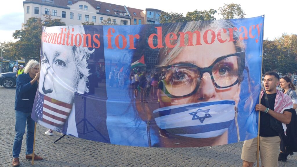 Ibrahim Ibrahim, representante del Comité Nacional Palestino Unificado en Berlín, pronunció un emotivo discurso en el que afirmó que «el silencio internacional ante los crímenes cometidos contra los palestinos es una participación indirecta en su continuación», y subrayó que el apoyo militar y político prestado por Estados Unidos y Alemania a Israel agrava la catástrofe humanitaria y prolonga la agresión.