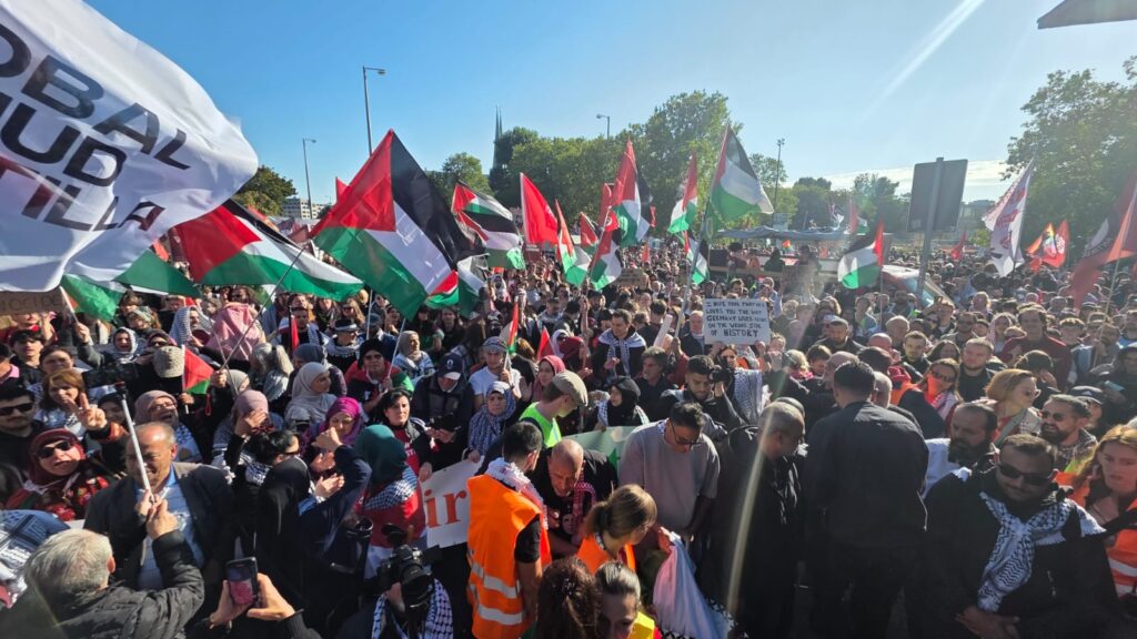 En un momento clave de la marcha, el activista palestino Ibrahim Ibrahim pronunció un discurso conmovedor en nombre de los comités de solidaridad. Describió lo que ocurre en Gaza y Cisjordania como un “genocidio sistemático”, subrayando que la lucha nacional palestina no se reduce a los hechos del 7 de octubre de 2023, sino que es la continuación de más de un siglo de resistencia, que comenzó con la Declaración Balfour de 1917, pasando por la Nakba (catástrofe), las intifadas (levantamientos populares) y la resistencia continua en el interior y en la diáspora.