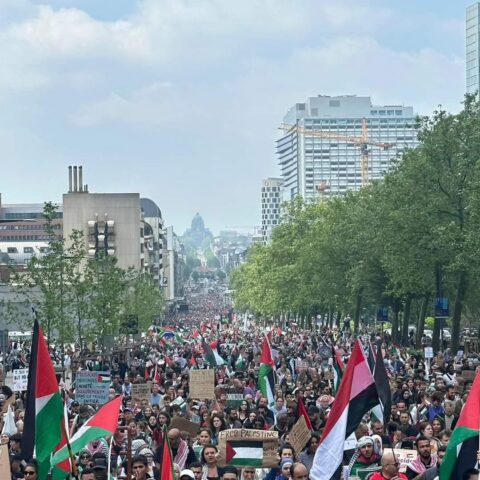 بلجيكا بروكسل شهدت العاصمة البلجيكية بروكسل مسيرة جماهيرية حاشدة انطلقت ظهر يوم الاحد من وسط العاصمة متجهة إلى مقر الاتحاد الأوروبي بمناسبة يوم النكبة للشعب الفلسطيني؛ نظمت تظاهرة جماهيرية حاشدة